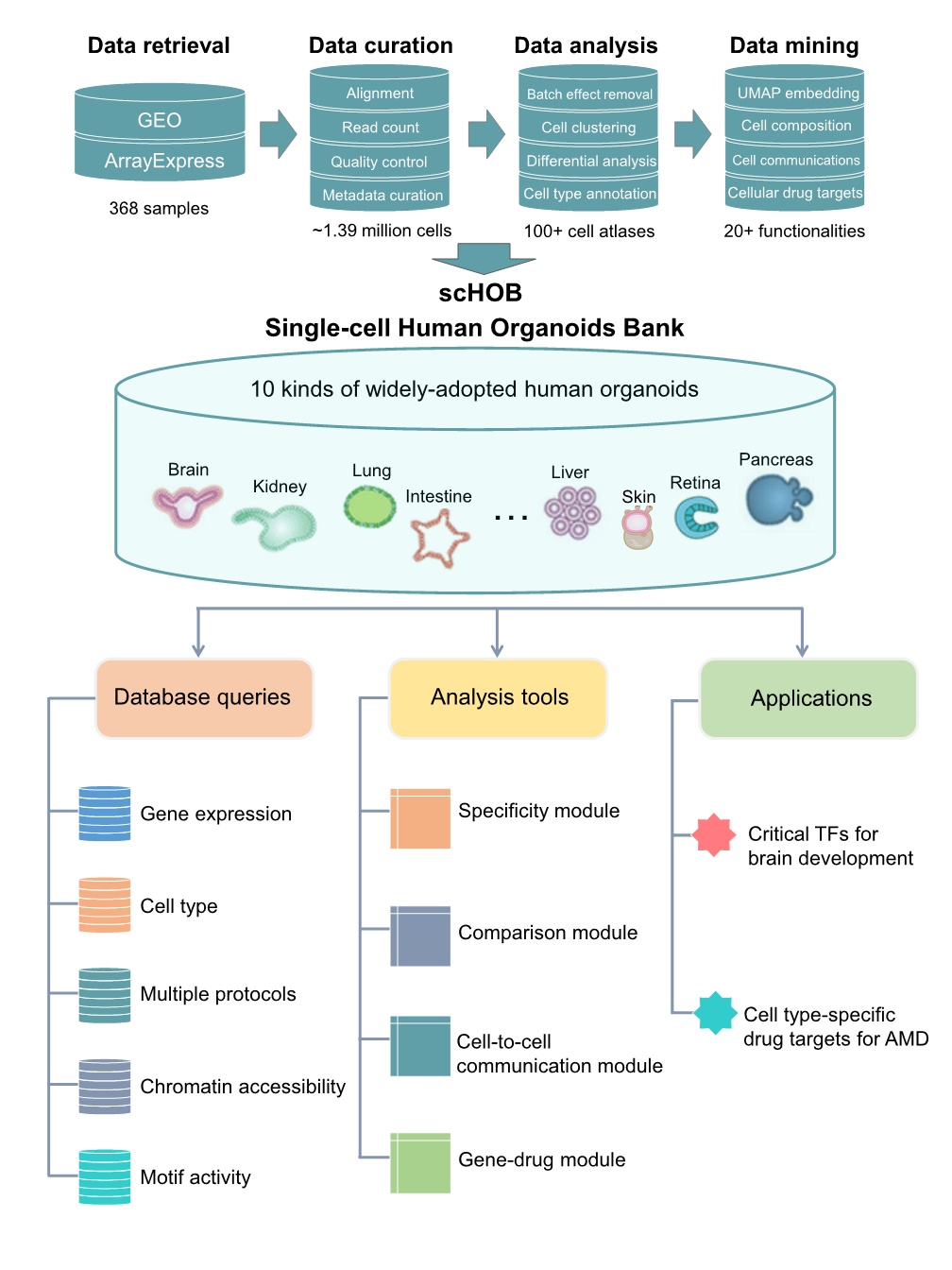 We curated and analyzed brain single-cell and single-nuclei sequencing data from 34 published studies, categorizing them into one discovery dataset and five replication datasets based on species origin (human, mouse, or organoid), brain developmental stage (adult or developing), and health status (disease or healthy): Discovery dataset: 327,639 cells from 140 healthy human brain samples across 14 anatomical regions. Replication datasets: (1) Human adult brain: 3,369,219 cells from 606 healthy brain samples across 10 regions. (2) Human developing brain: 599,221 cells from 733 brain samples, covering gestational weeks 6 to 40 and up to 8 months postnatal. (3) Mouse brain: 197,026 cells from 23 samples across 5 regions. (4) Human brain organoid: 396,049 cells from 25 organoid samples. (5) Human MDD brain: 160,222 cells from 37 MDD patients and 34 healthy controls. We applied four widely used integration methods—scPagwas, scDRS, LDSC-SEG, and MAGMA_CellTyping—to pinpoint MDD-relevant cell types and subpopulations. The resulting data are freely available for search, visualization, and download.